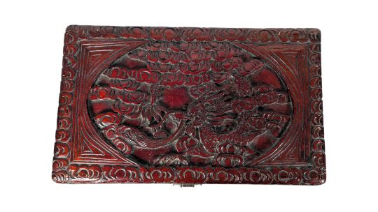 20th century vintage Chinese carved wooden chest. Decorated with scrolled motifs and Dragons to the sides and lid. Opening to reveal a spacious interior with a metal clasp to the front. Measuring approx. 20cm x 40cm x 23.5cm.