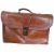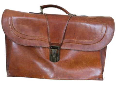 A 20th century vintage gentleman's travel vanity set housed within a leather case. Set to include a mirror, scissors, brushes, cologne bottle, and shaving accessories. Accompanied by a leather briefcase. Briefcase measuring approx. 28cm x 44cm x 15cm.