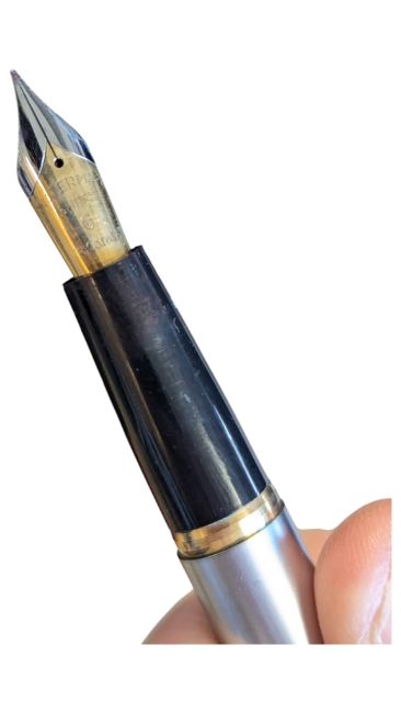 Waterman, France - A contemporary Waterman fountain ink pen. Silver chrome colourway super six 18 carat old nibb. Housed in an unassociated box. Together with a trio of Pen Quest ballpoint pens in a plastic case.