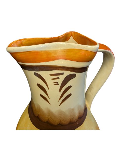 1930s Myott Son & Co Art Deco ceramic jug. Jug featuring a pinch neck design in an orange and brown hand painted colourway. Makers mark to the base and numbered 8318. Measuring approx. 20cm tall.