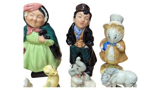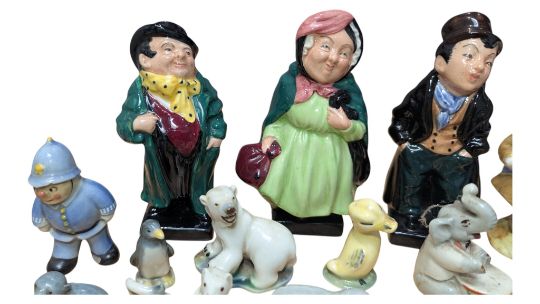 Collection of 20th century vintage small ceramic and china figures. Comprising of Royal Doulton's Artful Dodger, Sairy Gamp, Tony Weller, Beswick Beatrix Potter Amiable Guinea-Pig figure, and a collection of Wade miniature animal figures. Largest figure measuring approx. 11cm tall.