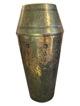 A collection of 20th century brass and copper items. The collection includes an Arts and Crafts repousse brass charger, a large brass foliate engraved charger, a pair of 1934 German Art Nouveau vases, a copper and brass repousse jug, an Arts and Crafts copper repousse decorative panel, and a floral inlaid metal lidded box. Makers stamps to the underside of some of the pieces.