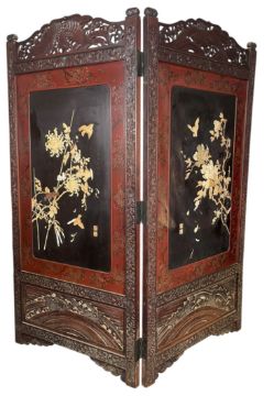 A late 19th century Japanese Meiji period two-fold room divider screen / discretion screen. The two-fold screen having a carved hardwood frame, decorated with birds and flowers. The central panels with Shibayama and lacquered decorations.
