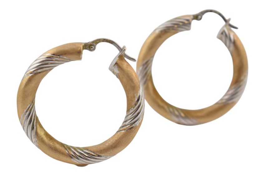 A pair of Italian 14ct bi-colour gold hoop earrings. Weight 3.3g. Measures 2.8cm