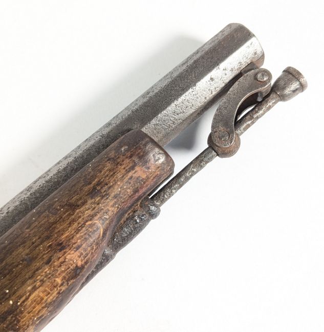 A 19th Century Victorian percussion cap Cavalry / Light Dragoon pistol having a steel butt plate with lanyard ring, full mahogany stock, brass trigger guard and side plate, octagonal barrel and swivel ram rod. Mechanism cocks and fires. Measures approx 34cm.