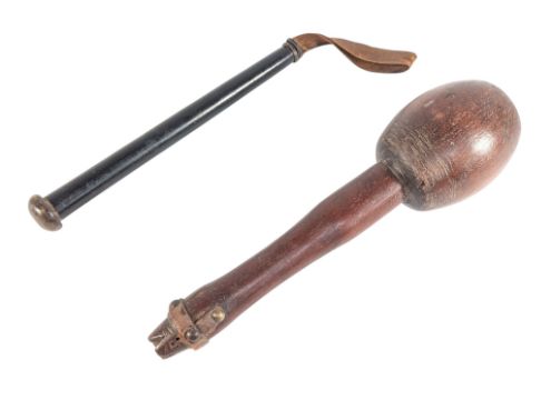A vintage wooden cudgel / Polynesian throwing club having a bulbous flat top head and a serrated pommel together with a black lacquered tipstaff baton with leather carry loop. Club measures approx 36cm.